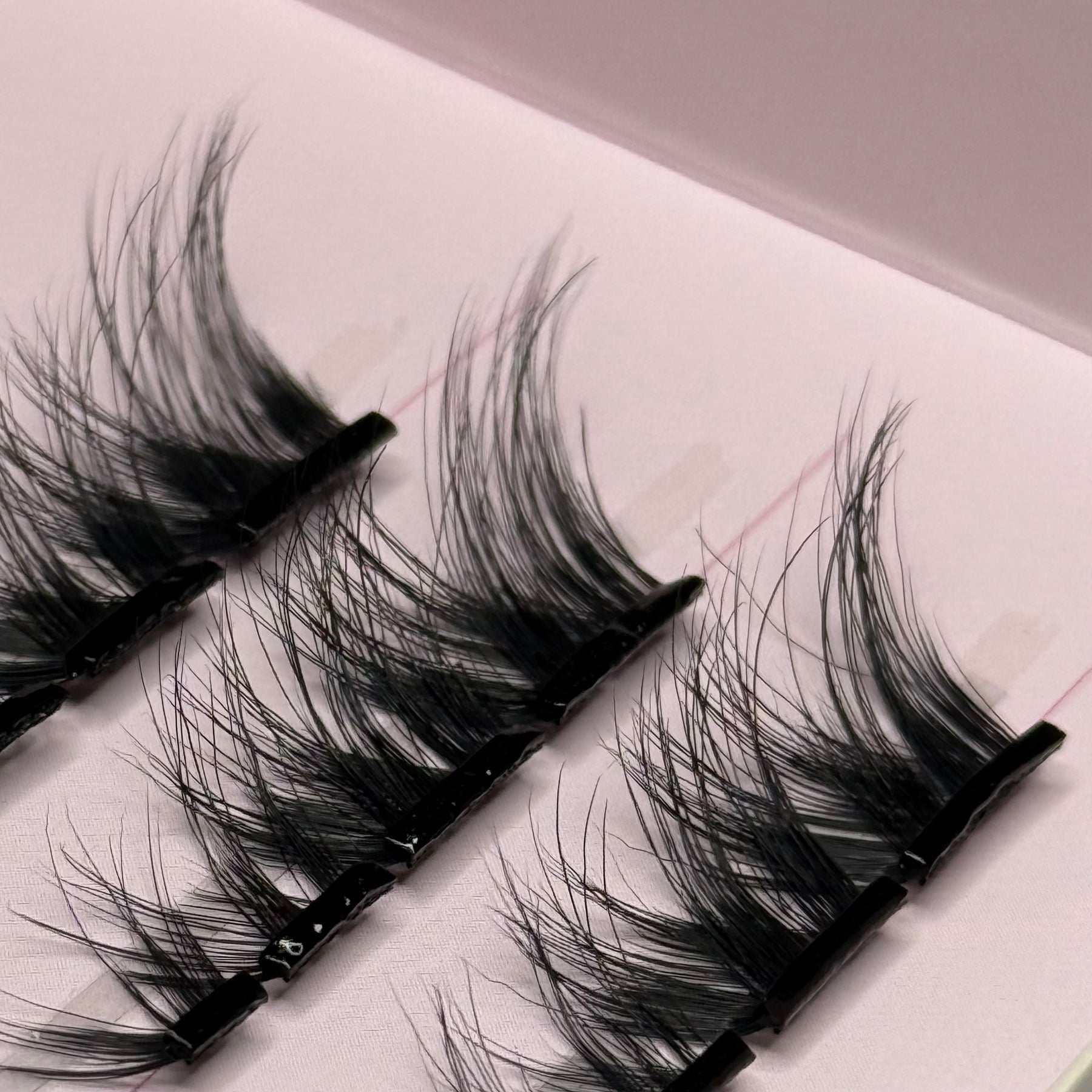 The Whisper style features a thicker bonding band for extra hold, ensuring a secure and long-lasting fit. Pre-designed with a winged shape, it includes four sets of carefully arranged lash clusters that create a beautifully layered, fluttery look. This unique design provides effortless volume and lift, perfect for adding subtle drama while maintaining a natural yet enhanced appearance.